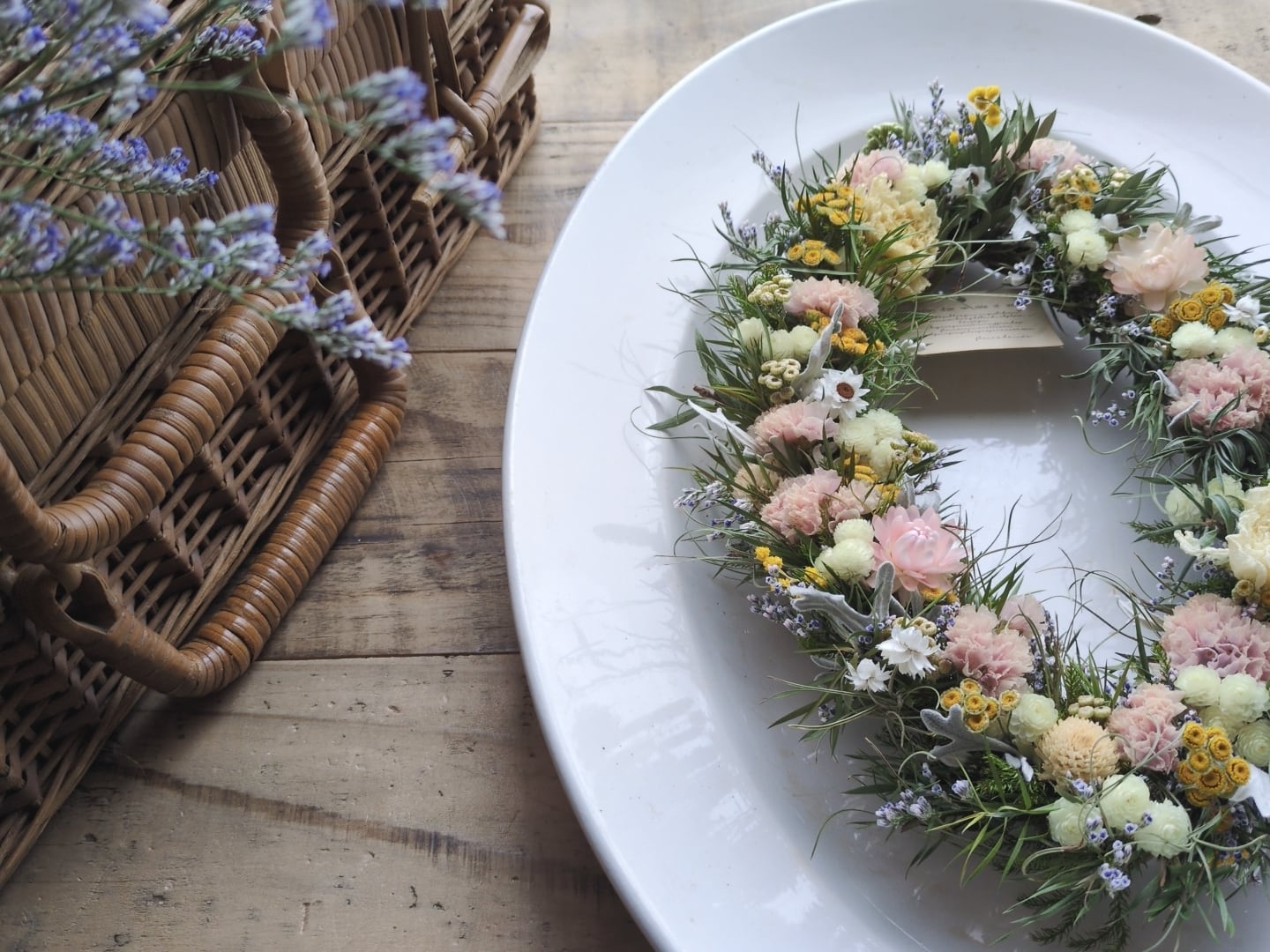 ピンク系の小花と白いラナンキュラスを合わせた、ナチュラルなオーバルリースです。