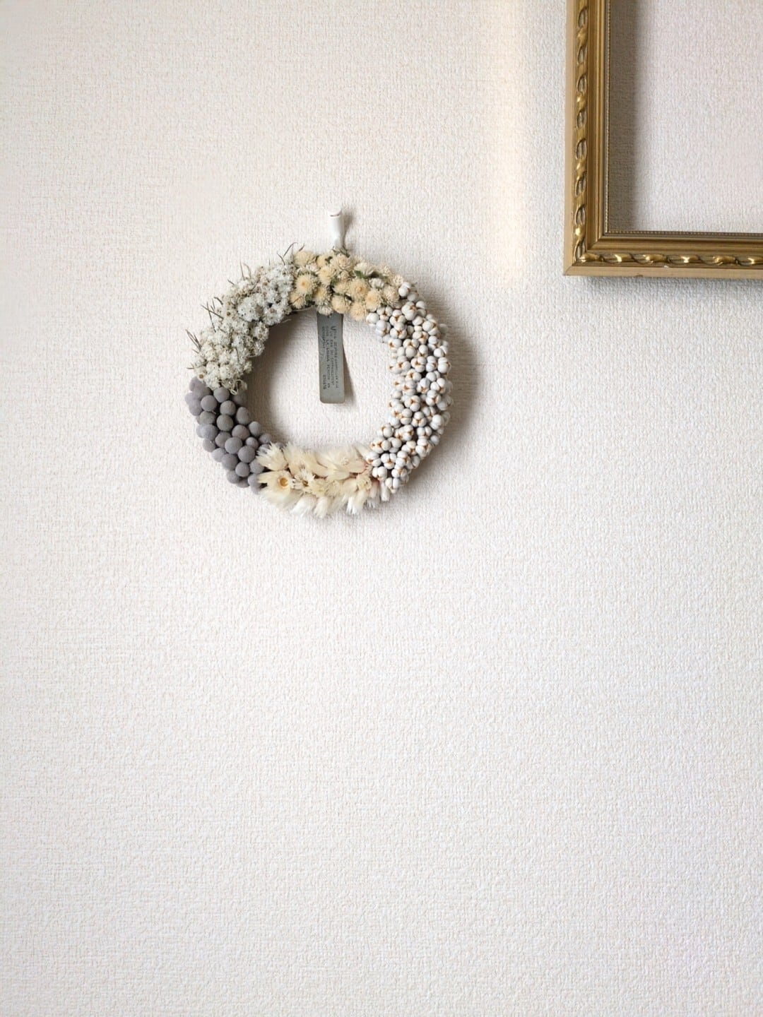 ナンキンハゼの乳白色の実やカワラハハコ、エバーラスティングの小さな白い花など…それぞれ異なる白が集まり、やさしく、静かな輪を描くリースに仕上げました。