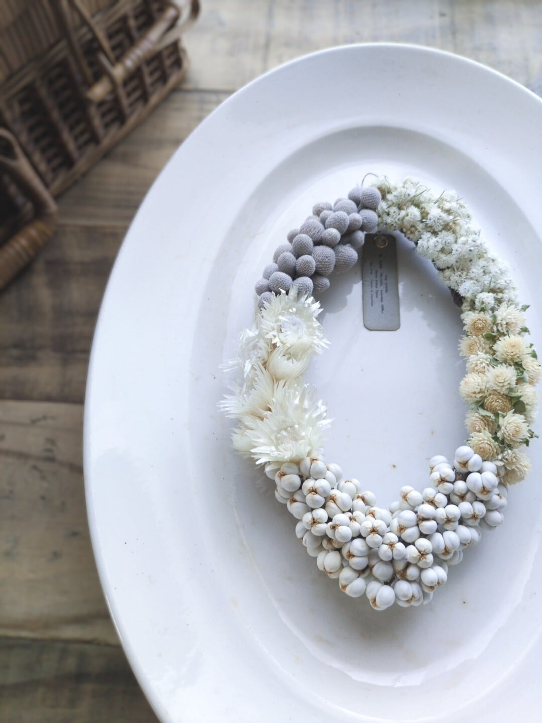 ナンキンハゼの乳白色の実やカワラハハコ、シルバーデージーの白い花など…それぞれ異なる白が集まり、やさしく、静かなオーバルを描くリースに仕上げました。