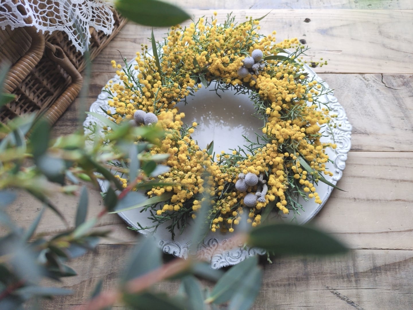 同じ“ミモザ”でも表情の違いを楽しめるリースです。