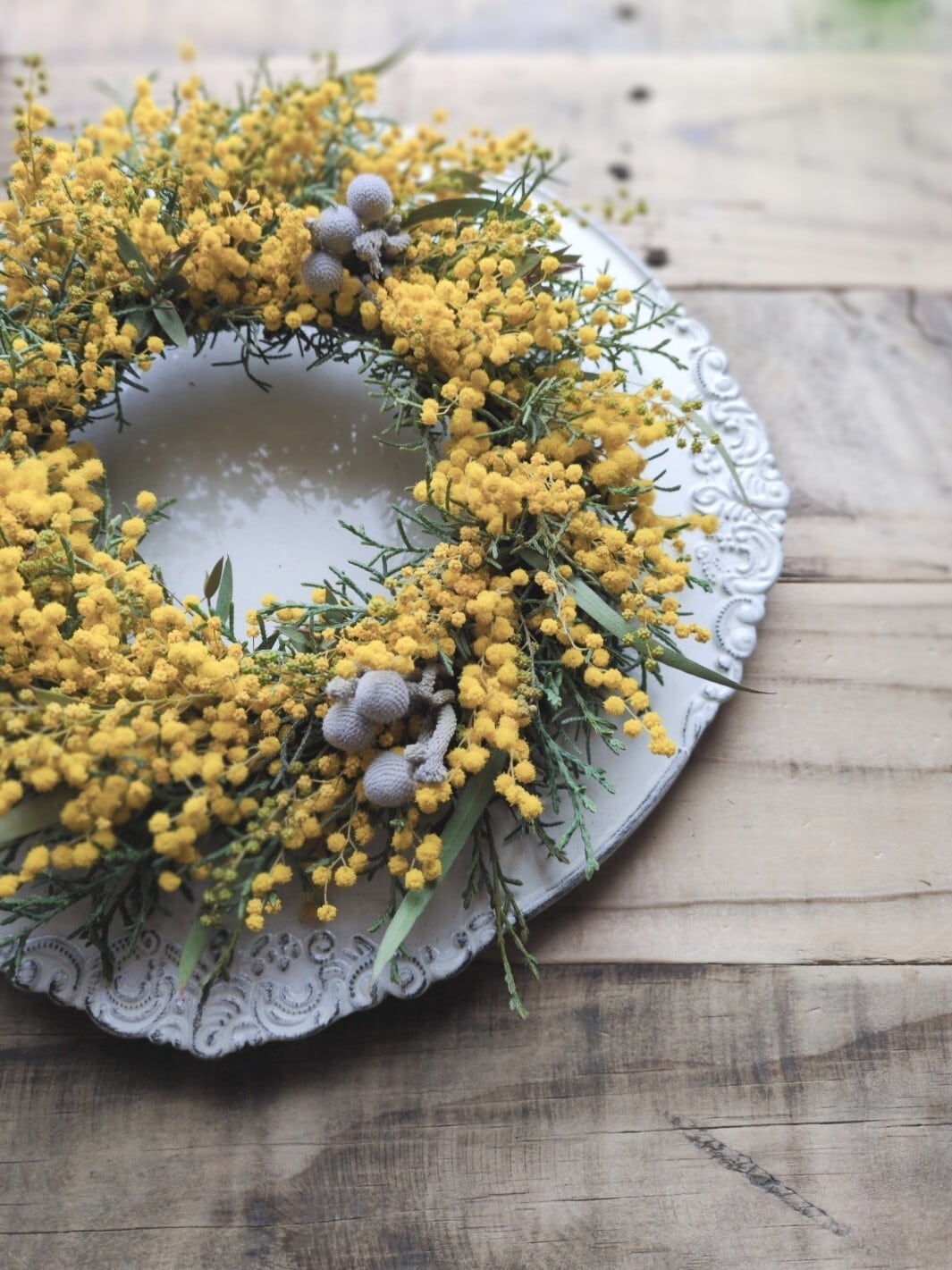 たっぷりとミモザを使いながらも、どこか懐かしい、北欧の暮らしにあるような、静かでやさしい雰囲気に仕上げました。