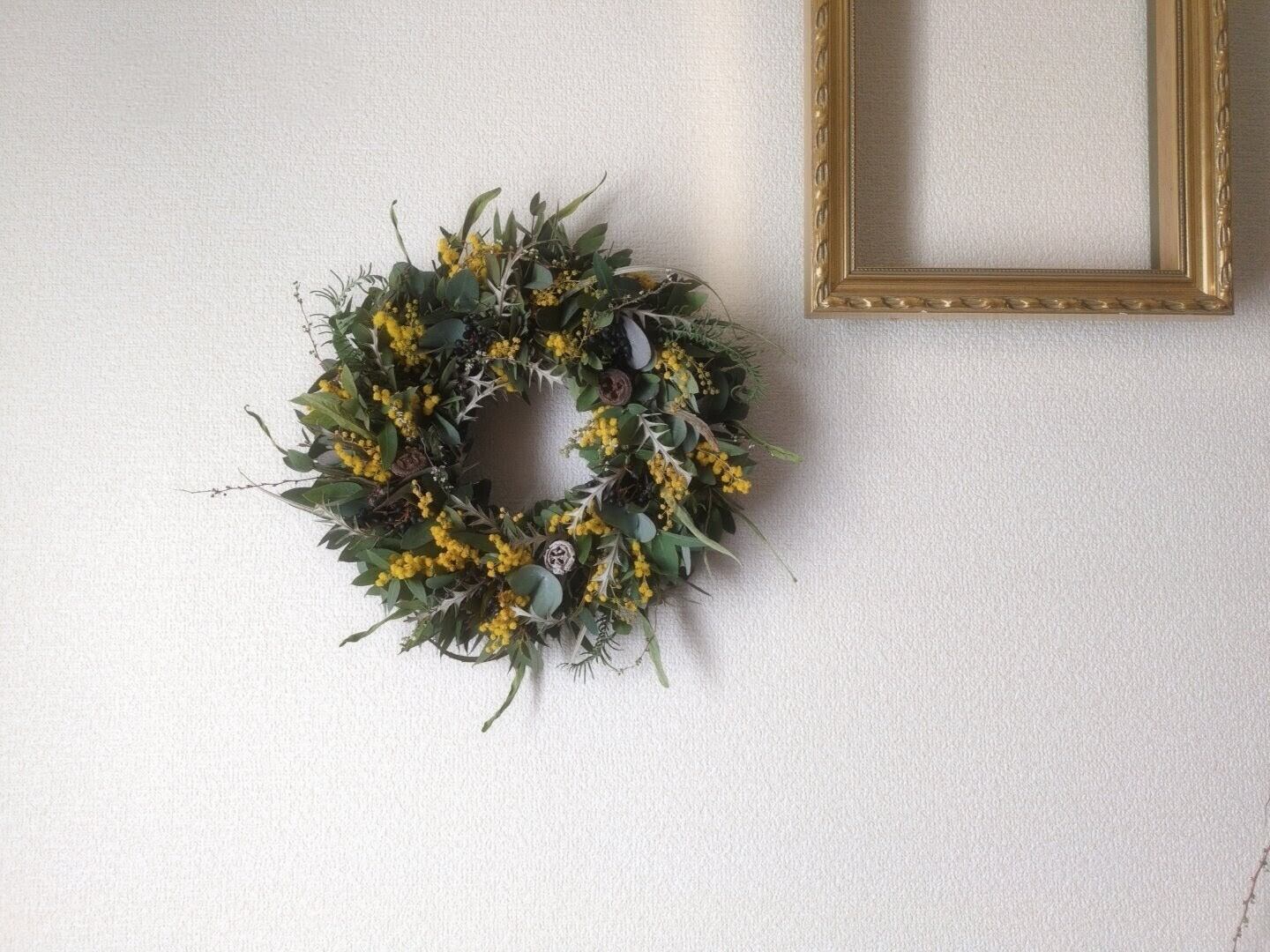 グリーンとミモザのラウンドリース ナチュラルリース 大きめ 【26207】